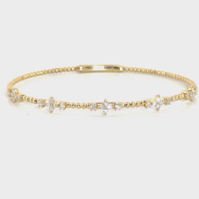 Crafted in 14K yellow gold, this flexible bangle showcases 0.60 carats of diamonds in a sophisticated design that moves with your wrist. The flexible construction provides comfortable everyday wear while maintaining the timeless elegance of diamond jewelry. Perfect for layering or wearing solo, this piece combines durability with refined style, making it an ideal addition to any fine jewelry collection.