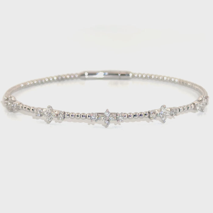 Elegant and versatile, this flexible bangle features 0.60 carats of diamonds set in lustrous 14K white gold. The flexible design allows for comfortable everyday wear while maintaining a sophisticated appearance. Diamonds are carefully selected for quality and brilliance, creating a timeless piece that transitions seamlessly from casual to formal occasions. The secure construction ensures durability, making this bangle a reliable addition to any jewelry collection. Perfect for those seeking understated luxury with lasting appeal.