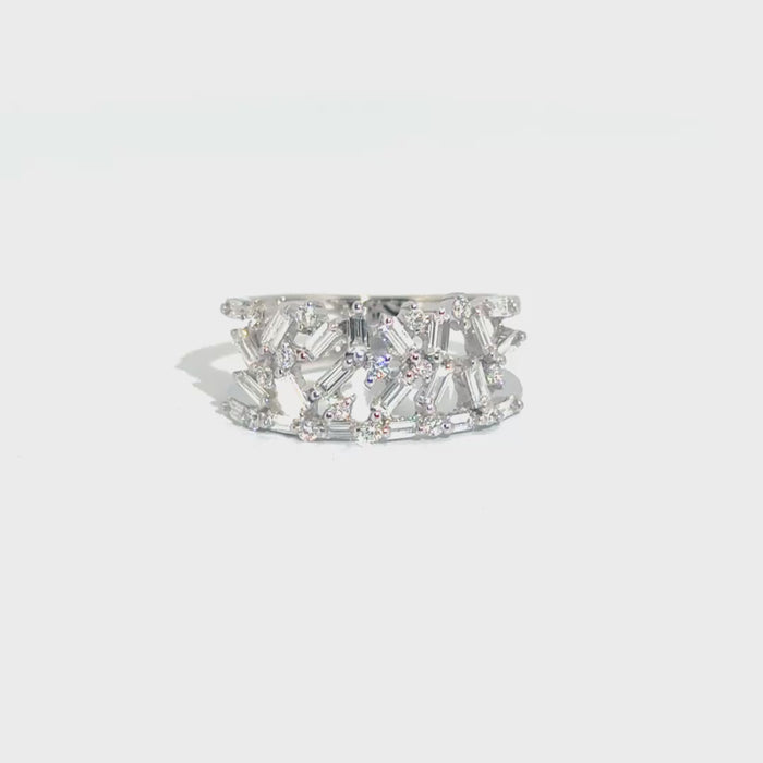 Elevate your everyday elegance with this sophisticated diamond fashion band, crafted in lustrous 14K white gold. Featuring a striking combination of baguette and round-cut natural diamonds, this piece delivers refined sparkle and timeless appeal. The alternating diamond shapes create visual interest while maintaining a sleek, wearable profile perfect for stacking or wearing solo. Ideal for those who appreciate quality craftsmanship and enduring style, this band complements both classic and contemporary aesthetics.