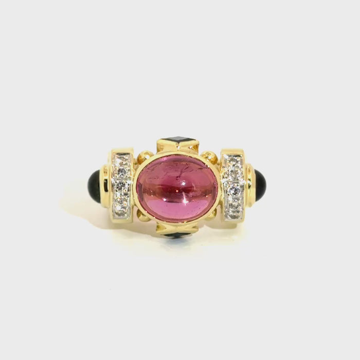 Home/Estate Rings/Oval Cabachon Cut Pink Tourmaline with Blue Sapphire & Green Tourmaline Accents in 14K Yellow Gold