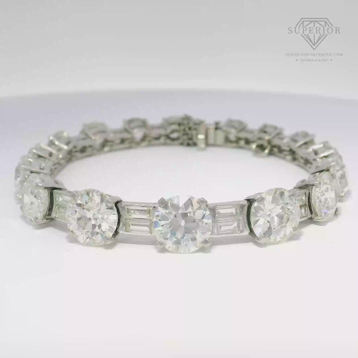 Elegant platinum bracelet featuring 30 carats total weight of natural Old Mine cut diamonds in a sophisticated mix of round and baguette cuts. The Old Mine cut round diamonds deliver warm, romantic sparkle characteristic of vintage craftsmanship, while baguette stones add refined linear accents, creating a balanced and timeless design. Crafted in platinum for exceptional durability and a luxurious white luster that complements the diamond brilliance. Perfect for special occasions or as a statement piece for everyday luxury.